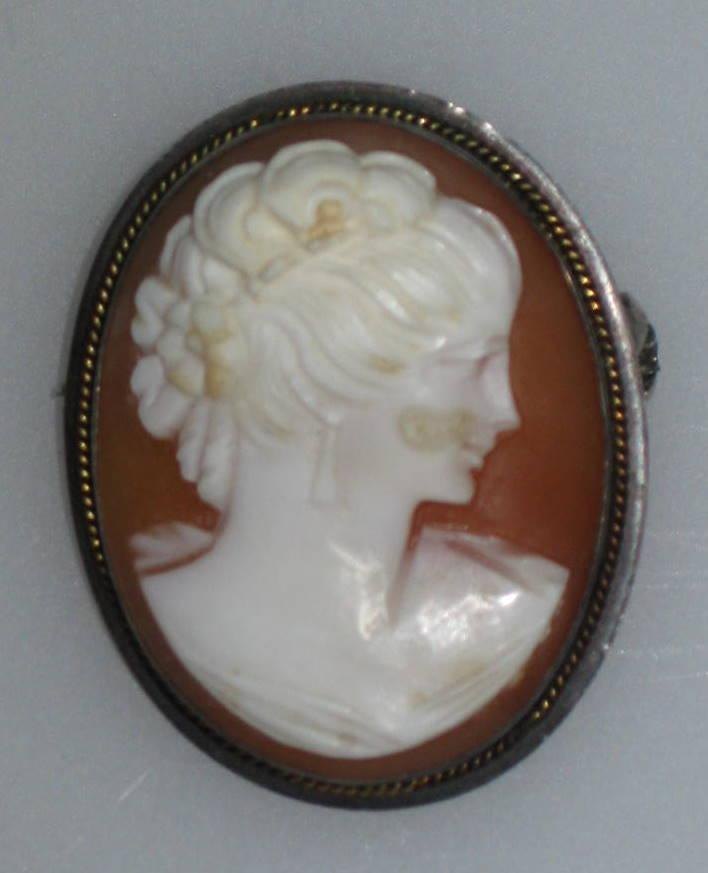 Brosche i Camé med kvinde i profil. H.: 3,2 cm. B.: 2,2 cm. Med sølvramme.