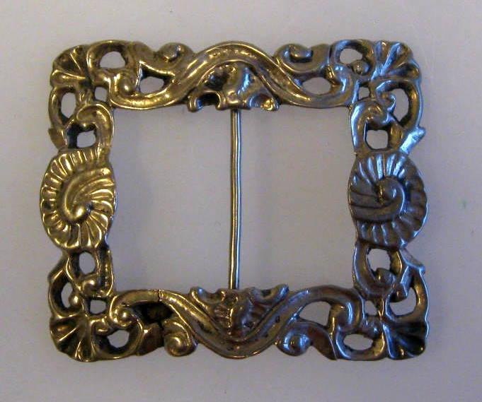 Bæltespænde i sølv, 19. årh. Antagelig Rusland. Dekoreret med bladværk og rocailler. Stemplet.: AD 84. Vægt.: 34,2 gram. 6,5 x 6 cm. Med graveringer.