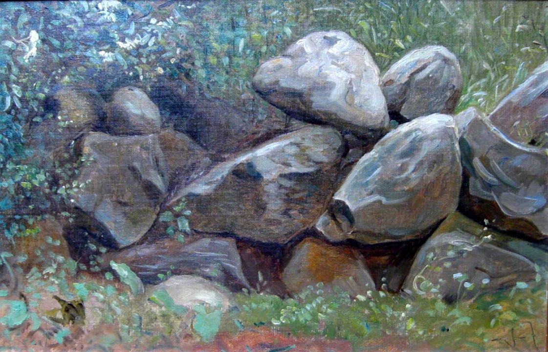 Irminger, Valdemar (1850 - 1938) Danmark: Store sten, Refnsnæs. Olie på lærred. Signeret: Monogram. 34 x 52 cm.