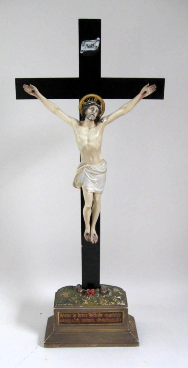 Krucifiks, 19. årh. Tyskland, lidelseskors, bemalet træ og gips. Med tekst på fod.: Vater in deine Hände empfehle ich meinen Geist. H.: 80 cm. B.: 33 cm.