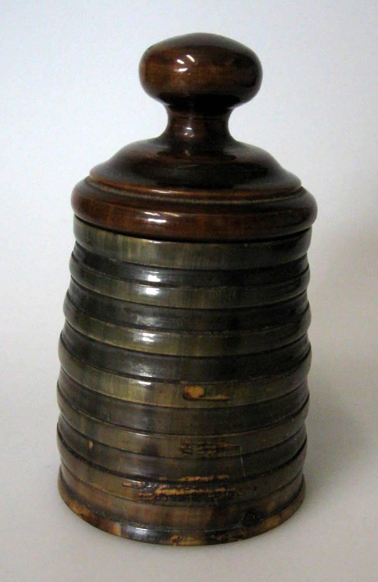Beholder i drejet horn med låg i træ, Danmark, 19. årh. H.: 10 cm. Dia.: 6 cm. Fantastisk flot stand!