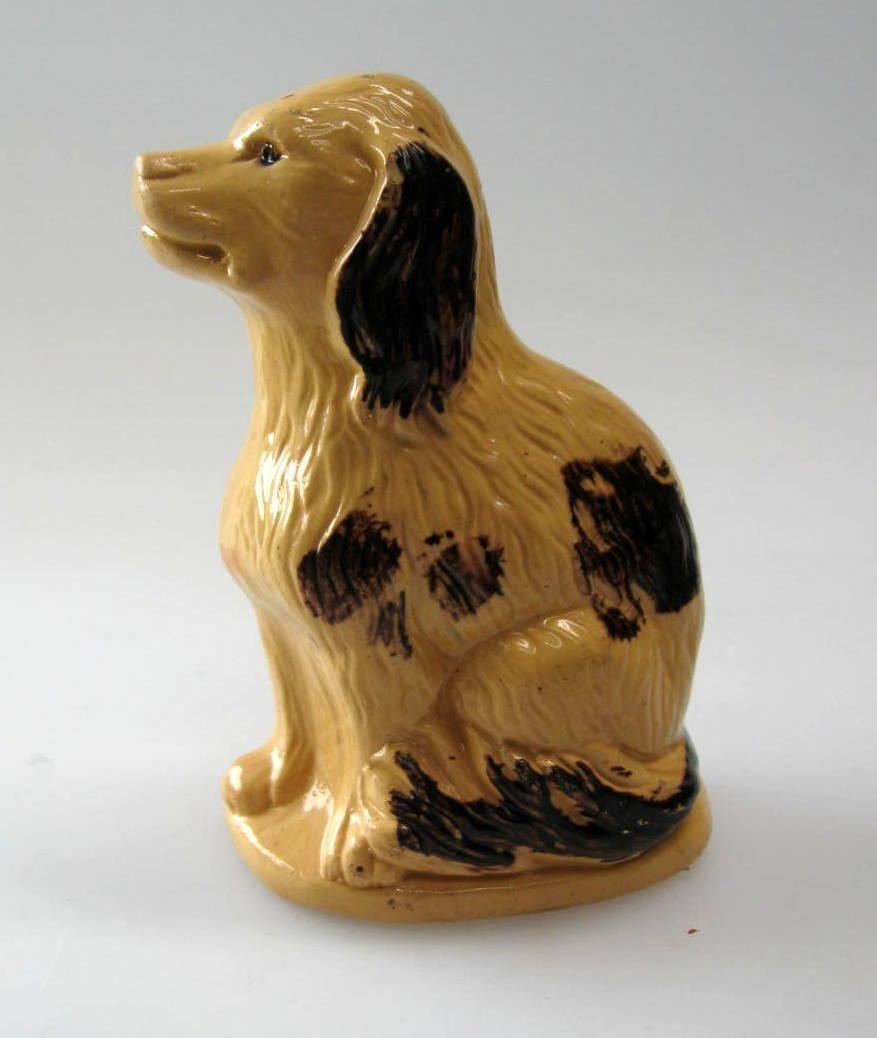 Money bank in the form of seated dog, Bornholm, Cocker Spaniel. 19th century. Yellowish and brownish glaze. H .: 13 cm.