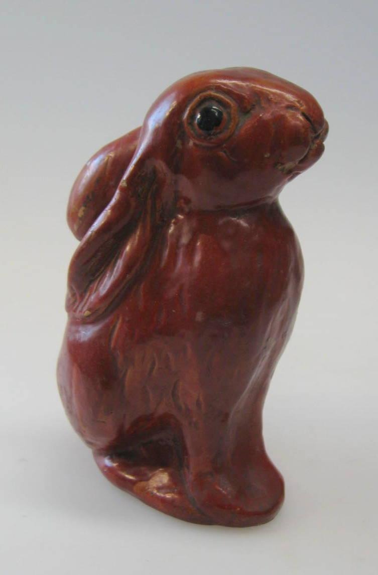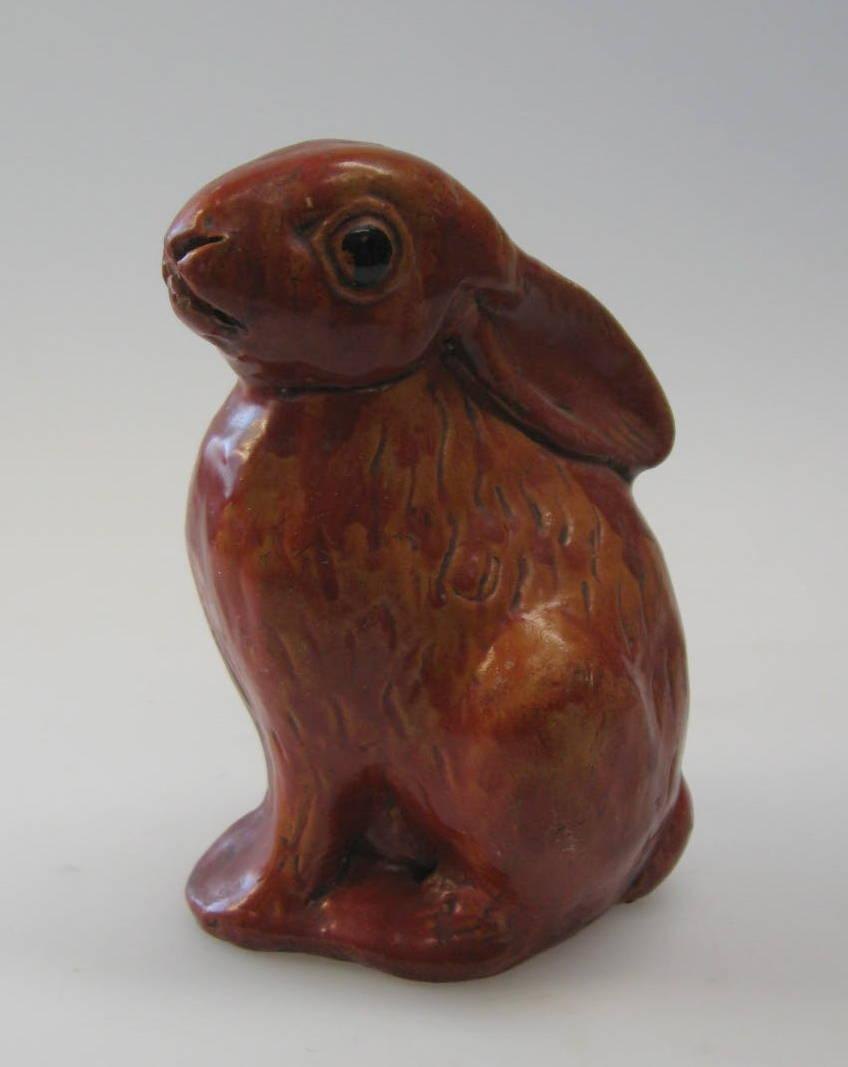 Sparebøsse i ler, Bornhom, 19. årh. I form af siddende hare. Rød glaseret med sorte øjne. H: 14 cm. Fantastisk stand!