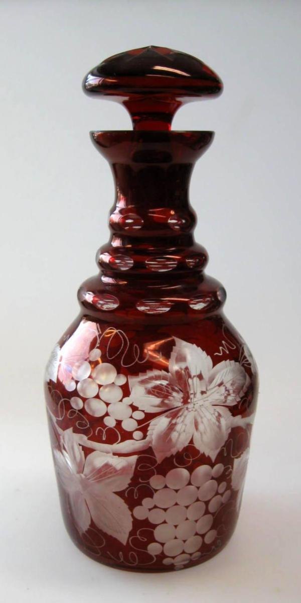 Stor bømisk krystal karaffel, o. 1920. Med rødt overfang med slibninger i form af vinranker og vinblade. Med prop med stjerneslibning. H.: 27 cm.
