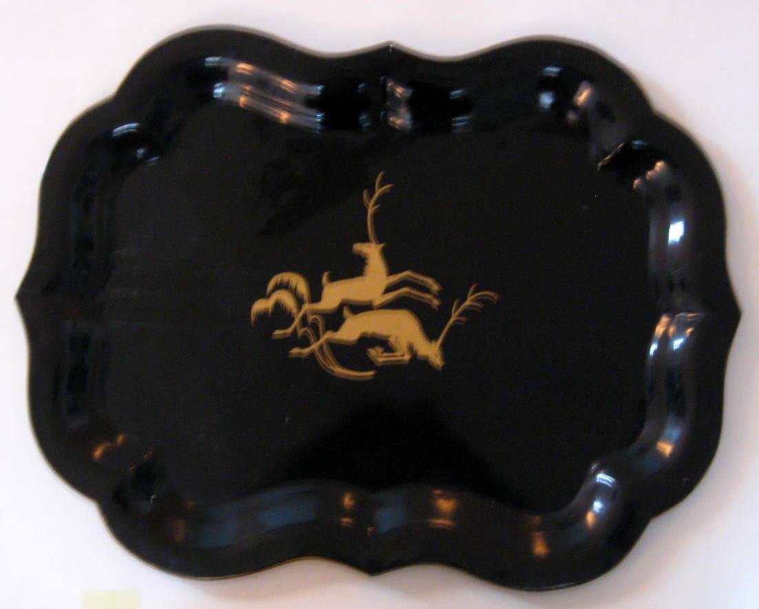 Metalbakke, 19. årh. Sortmalet metal. Rococo form. Dekoreret med springende krondyr. L.: 62 cm. B.: 48 cm.