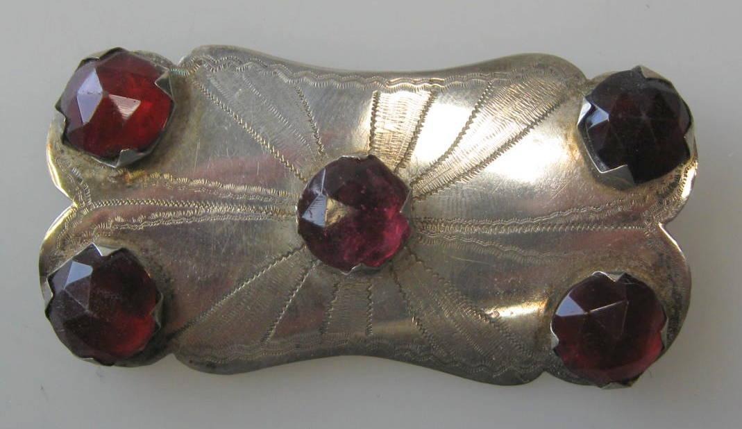 Antikt dansk bæltespænde i sølv med røde glasflusser, mester Jens Clausen, Sønderborg (1808 - 1864). L.: 6,5 cm. Spændet er ciceleret. Stemplet.