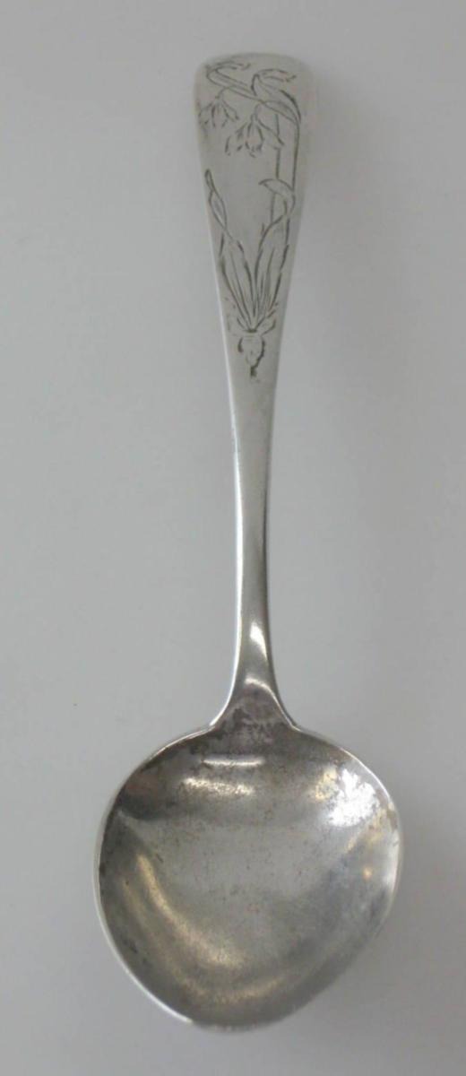 Spiseske i sølv, mester Mathias Møller (1813 - 1868), Haderslev. Danmark. Skæfte med dekoration i form af blomster. L.: 21 cm. Vægt.: 43 gram. Stemplet.: Möller.