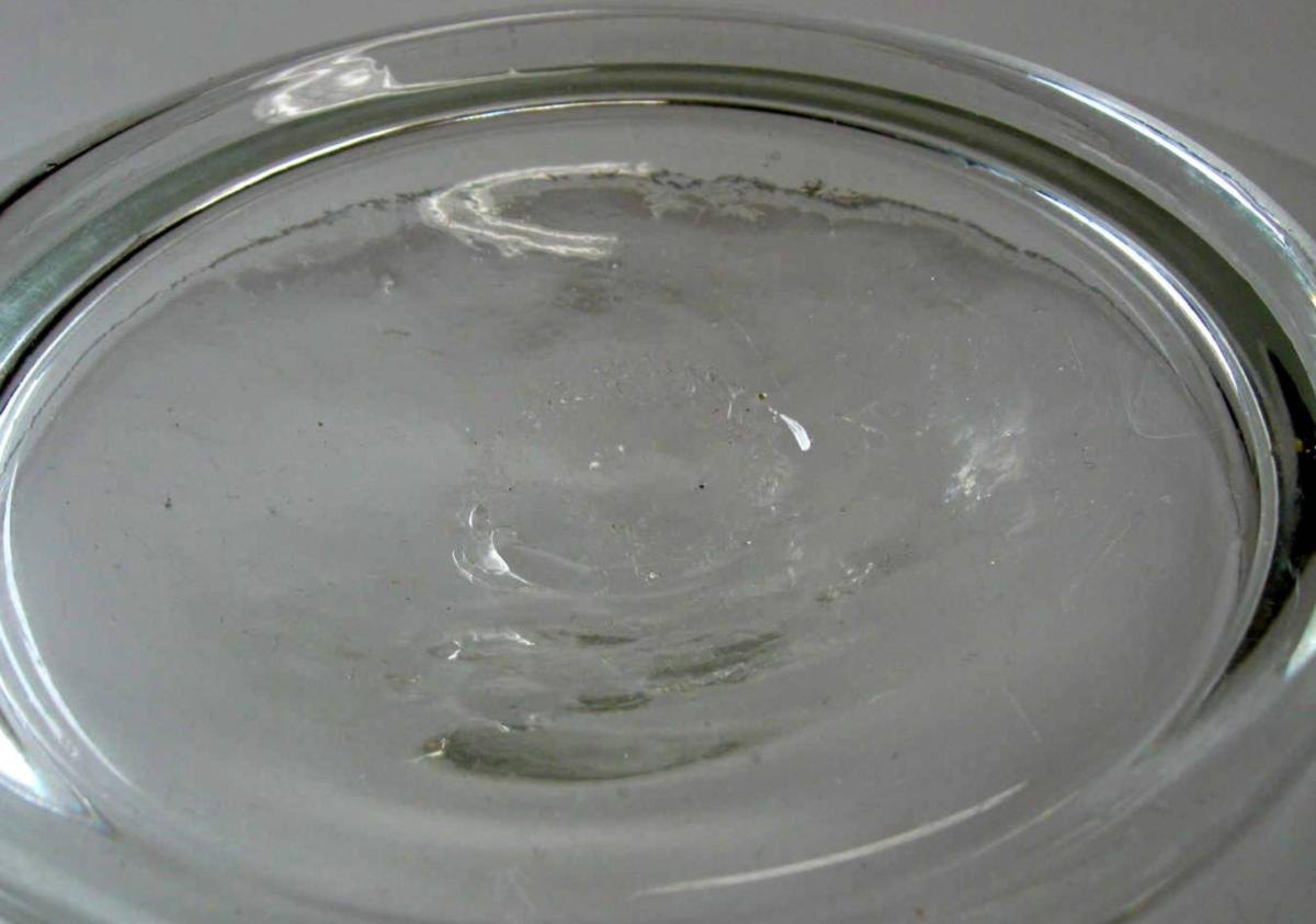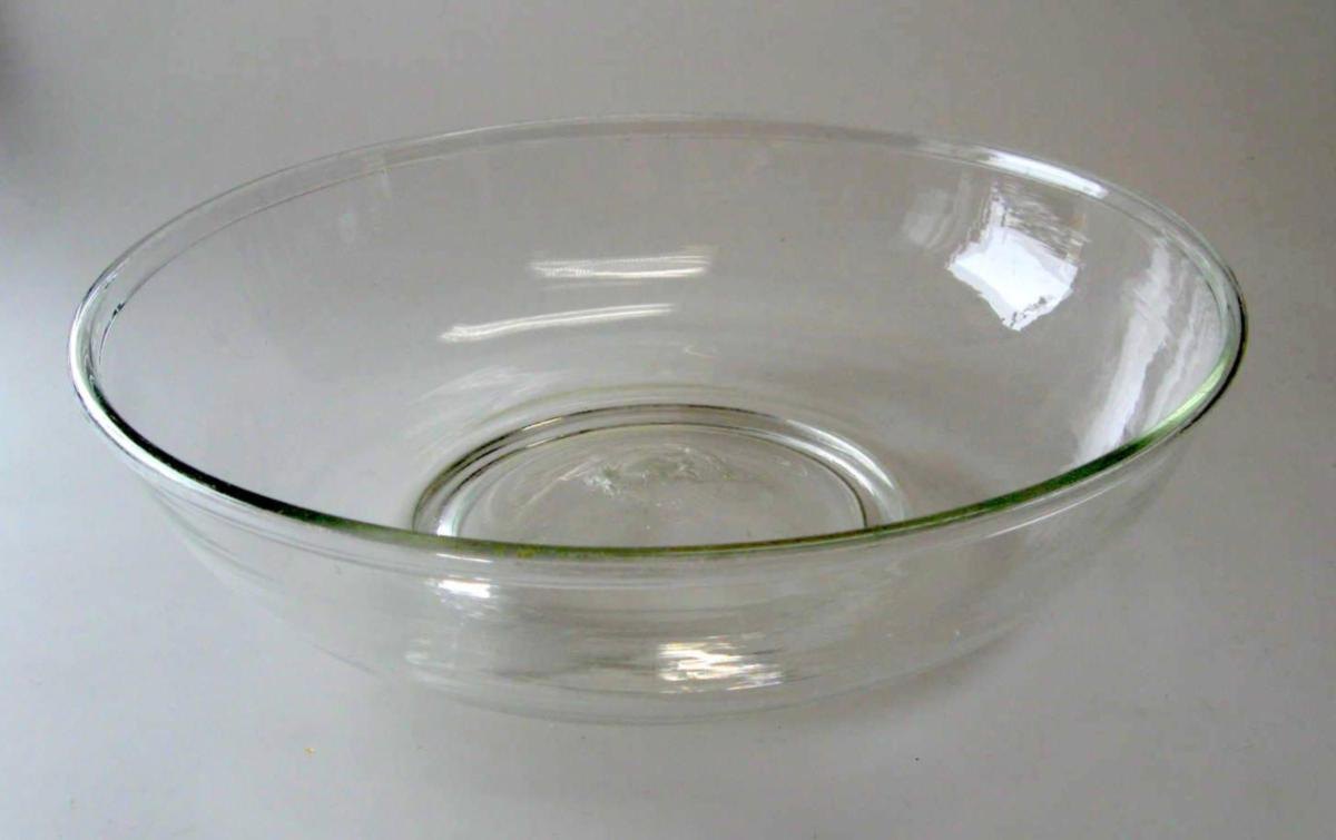 Dansk antikt mælke fad, 19. årh. På lav ringfod og kuglet bund. Antagelig Holmegård. H.: 7 cm. Dia.: 22,5 cm.