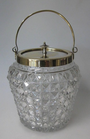 Engelsk bisquitspand, o. 1900, i klart glas. I bunden stemplet med mærket.: Rd 45942. Med låg og hank i messing - tidligere forsølvet. Højde.: 15 cm. Højde med hank.: 23 cm.