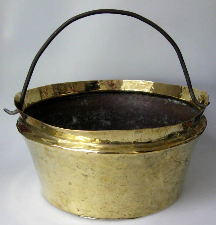 Flensborgsspand i messing, 19. årh. Med jernhank. H.: 14,5 cm. Dia.: 28,5 cm. Højde til hank:: 27 cm.