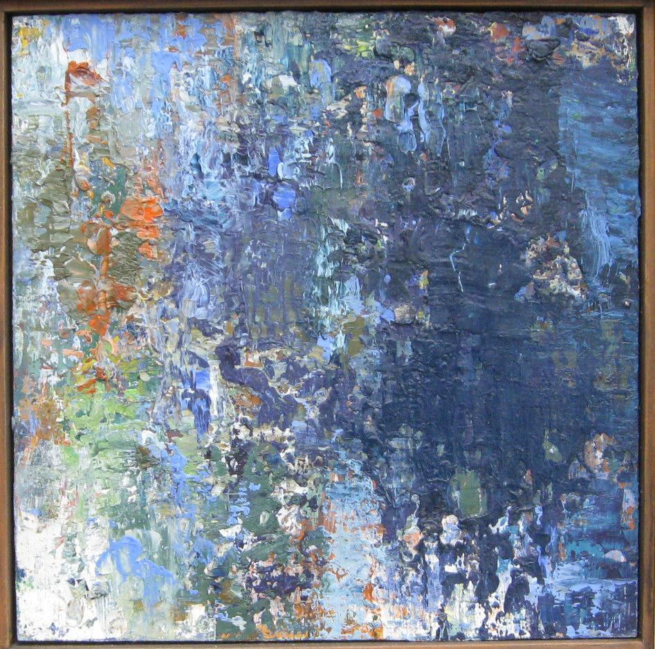 Frank, Niels (1946 - ) Danmark: Maleri II. 1999. Olie på masonit. Betegnet på bagsiden. 21 x 21 cm. Med hvid træramme.
