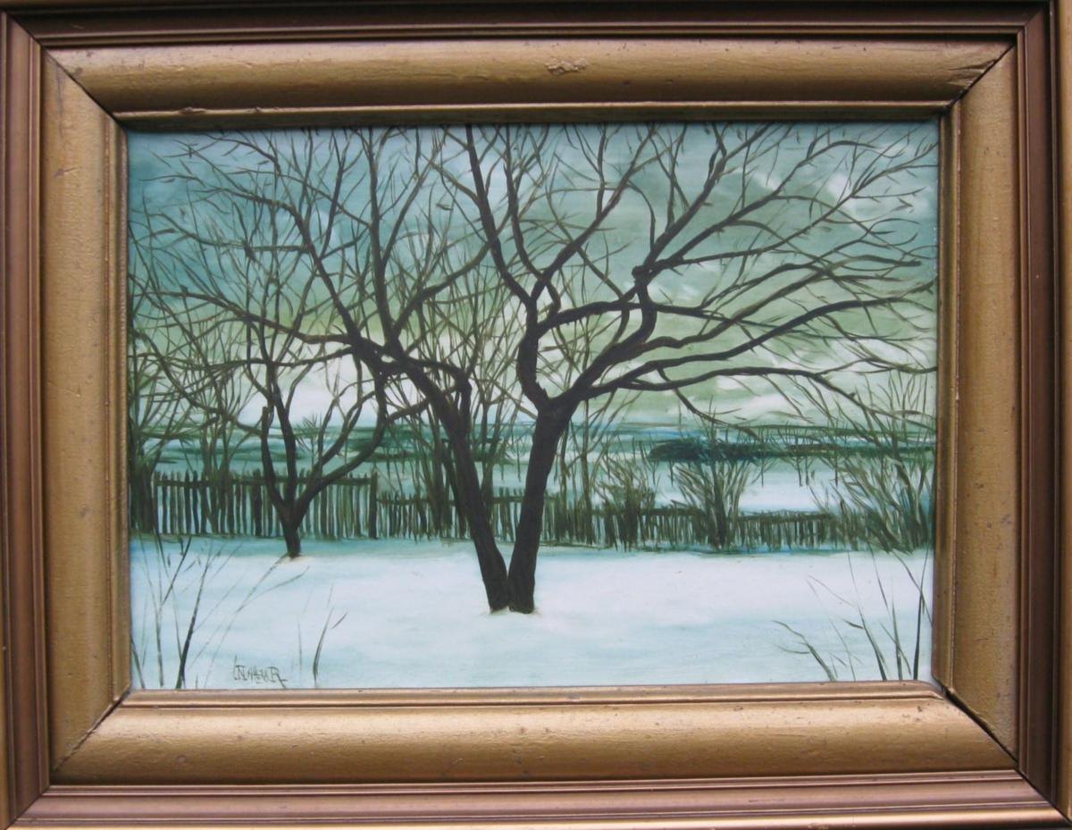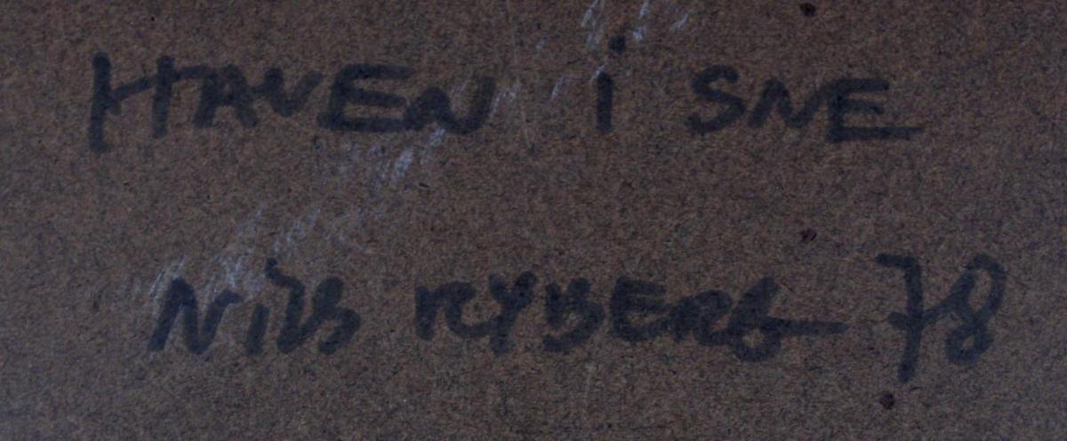 Ryberg, Niels (1946 -): Haven i sne. Olie på masonit. Sign.: Monogram 6.12.1978. 24 x 35 cm. Endvidere signeret på bagsiden med titel. Med ældre bronzeret ramme.