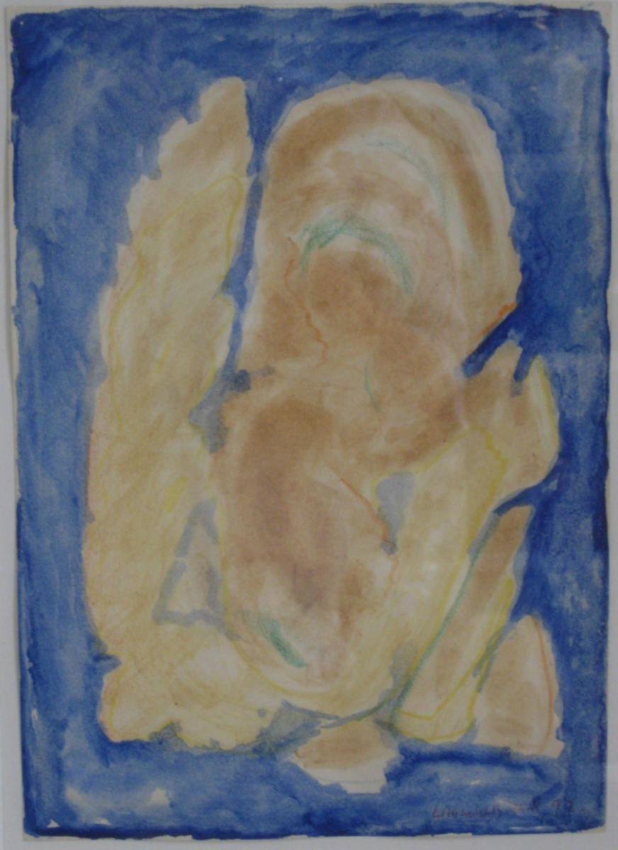Lilliendahl, Alfred H. (1909 - ) Danmark: Komposition. Akvarel, pastel på papir. Signeret.: Lilliandahl 25-8-72. 30 x 21 cm.  Indrammet: Med hvid træ ramme. 49 x 39 cm. På bagsiden dedikation til Jørgen Nash og Lis Zwick 1999. Proveniens.: Drakabyggets Kunsthal, Sverige.