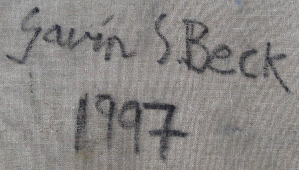 Beck, Gavin Shaun (20. årh.) Danmark: Stille ø i kosmos 4. 59 x 51 cm. Signeret på bagsiden.: Gavin S. Beck.