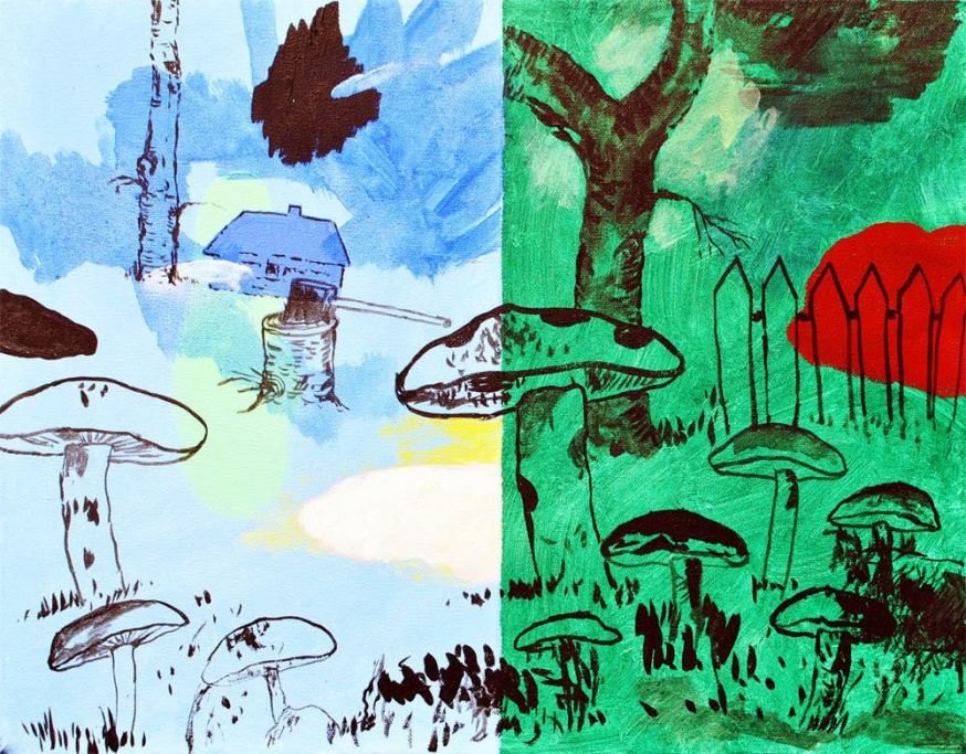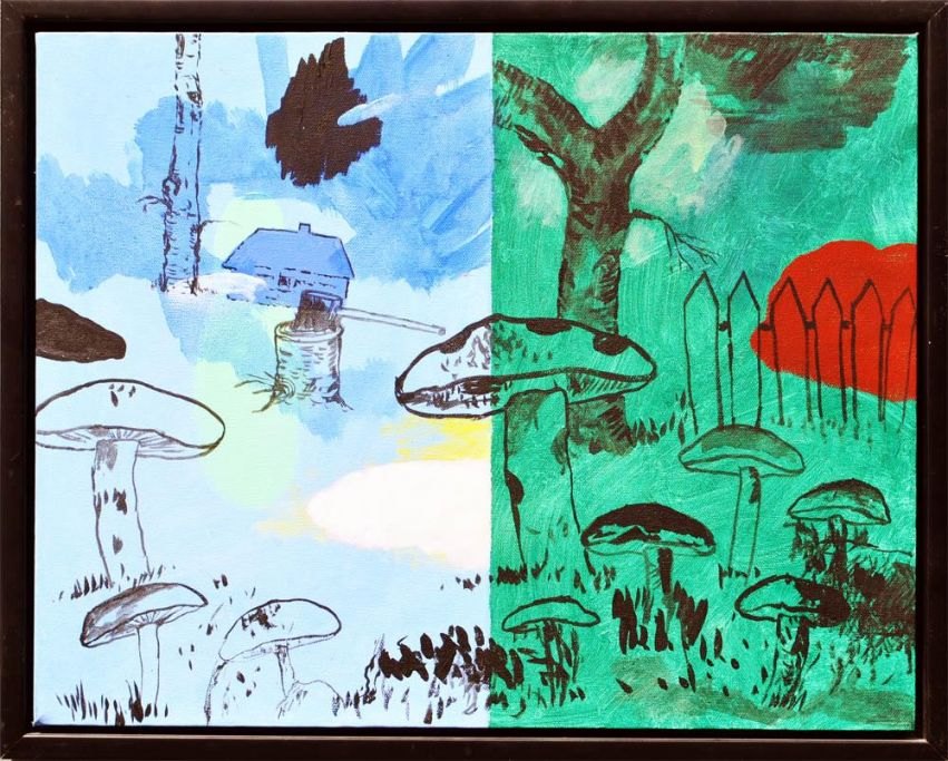 Nielsen, Hans Helge (1942- ) Danmark: Træstub. Olie på lærred. 40 x 50 cm. Signeret: På bagsiden med datoen: 7.8.2008. Med sort svæveramme.