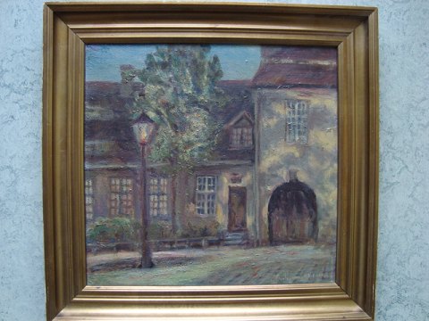 Maleri af Carl Milton Jensen - smuk ejendom, aften.