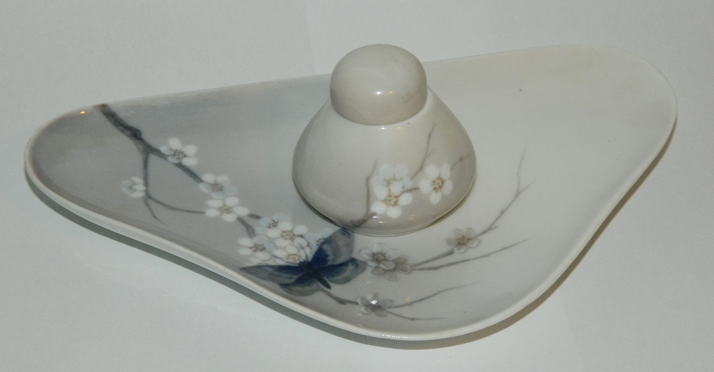 Porcelæn fra skønvirkeperioden 1900-1923: Blækhus i porcelæn fra Royal Copenhagen. Dekoreret med blomster og sommerfugl. Fremstår i perfekt stand. 1. sortering. Ingen skader eller reparationer. Fabriksmærket på Bunden. Bakken er 19½ cm lang og 11 cm dyb.