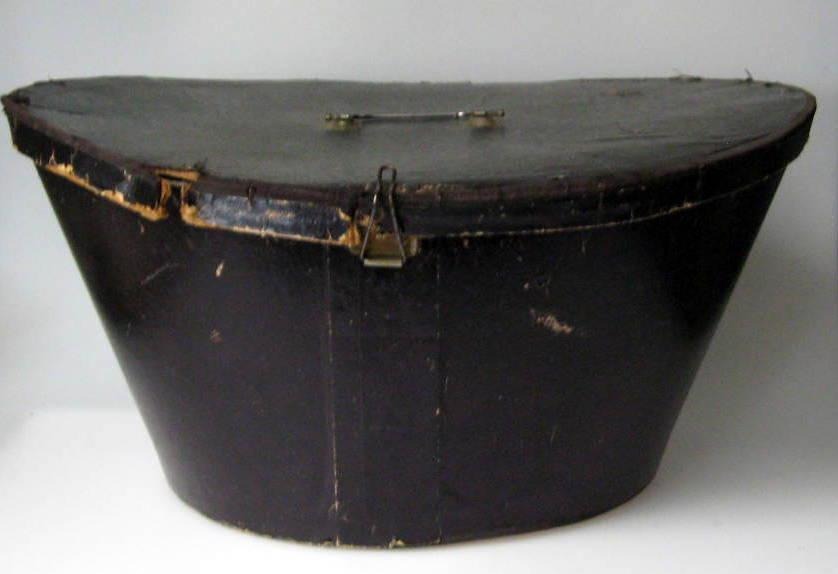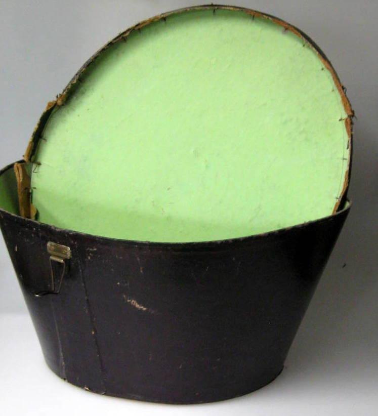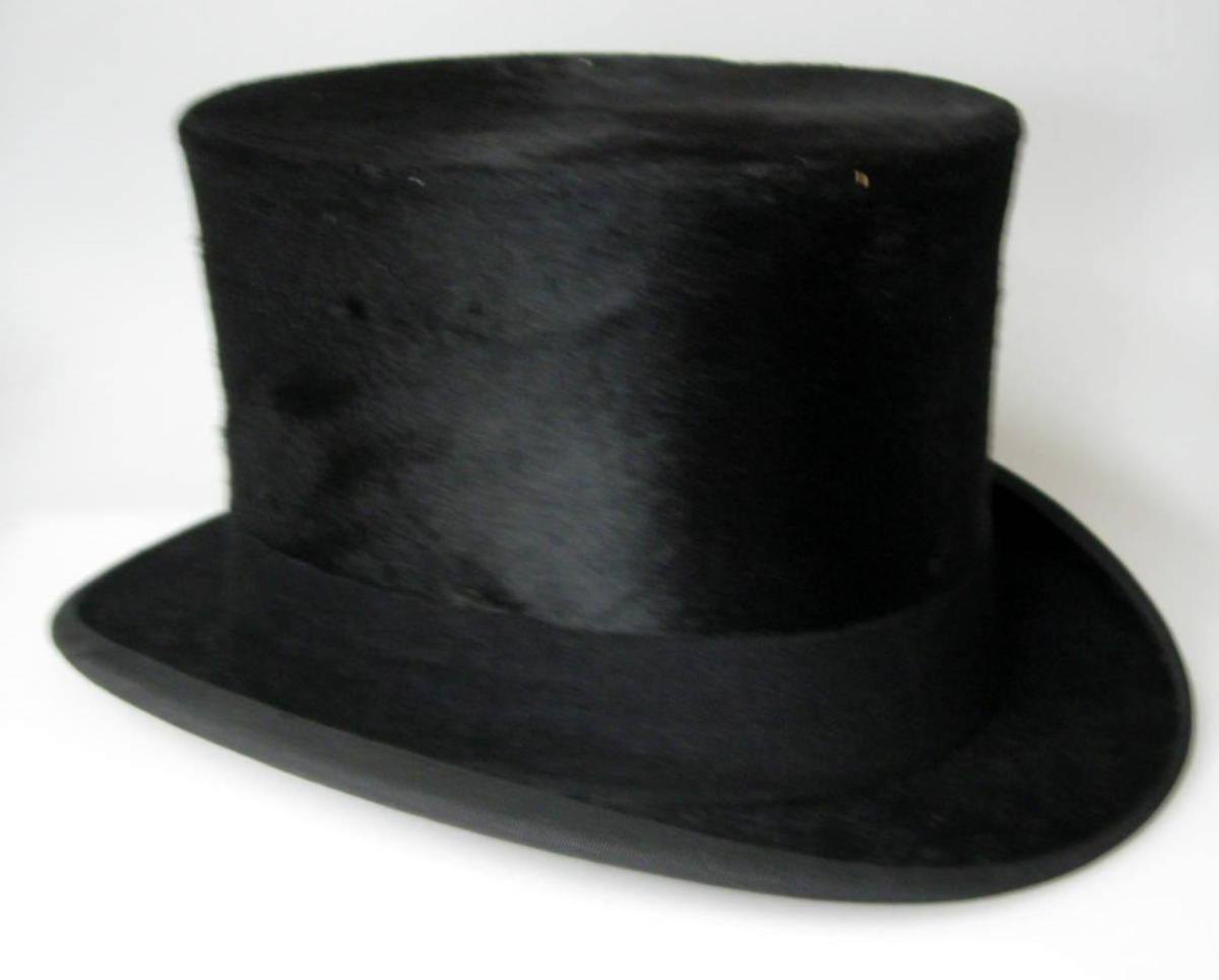 Høj hat i mulvarpeskind med tilhørende æske og sorte handsker. 19. årh. Hatten er af engelsk fabrikat. Indvendig med silkeog kant i læder. Med stempel. Indvendig mål: L.: 20 cm. B.: 16,5 cm. Æske i sort pap med hængsler og hank i metal.