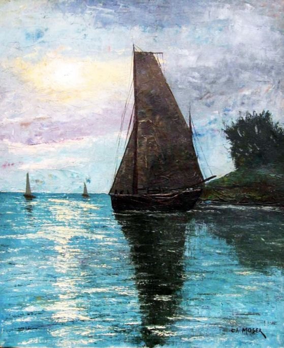 Moser, Christian (1838 - 1894) Holland: Sejlbåde på havet. Olie på lærred. Signeret.: Ch. Moser. 60 x 51 cm. Uindrammet. Proveniens: Dansk privatsamling. Der findes flere værker af kunstneren i Danmark.