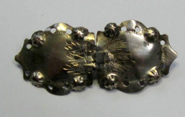 Antikt kåbe spænde i sølv, sølvsmed Wilhelm Sivertsen (1827 - 1847) København, omgjort til brosche. Stemplet WS (no. 1340). Dekoration i form af bukler og indgraveringer. L.: 5 cm.