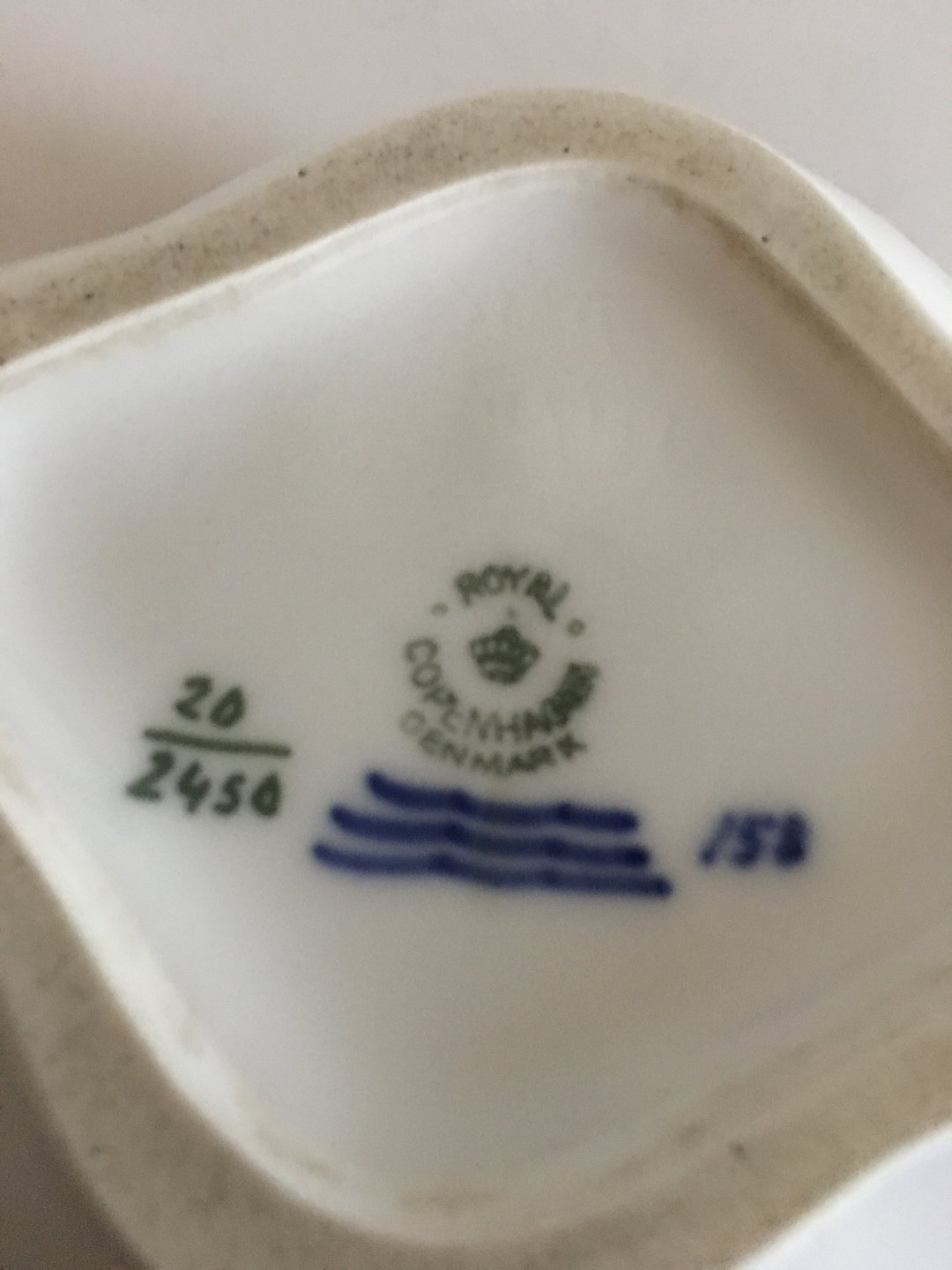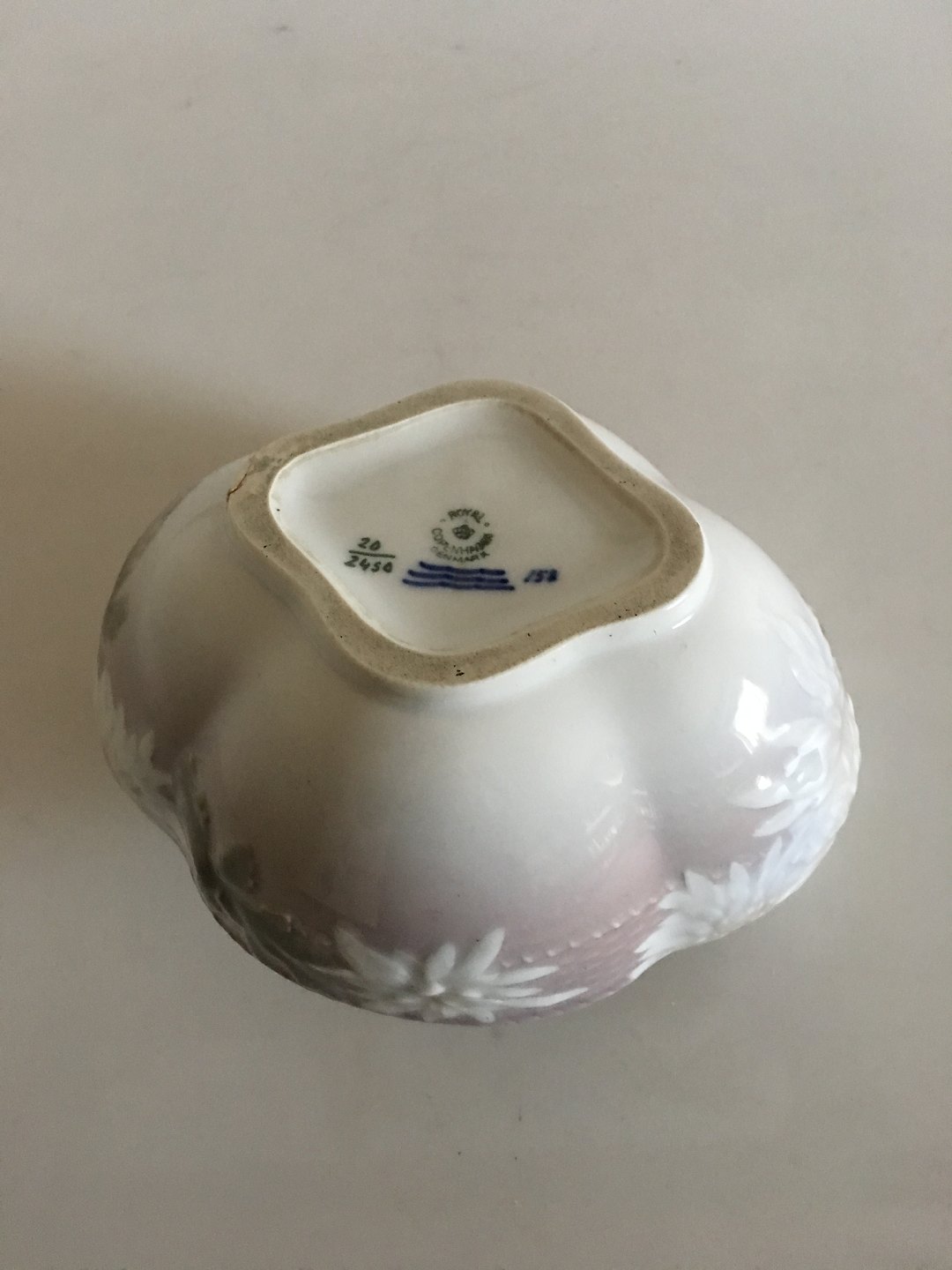Royal Copenhagen Art Nouveau Skål No 20/2450. Måler 19,5cm x 15,5cm x 10cm ( 7 2/3" x 6 1/10" x 4" ). Er i god stand, men mærket som anden sortering, da den har en brændingsrevne i bunden.