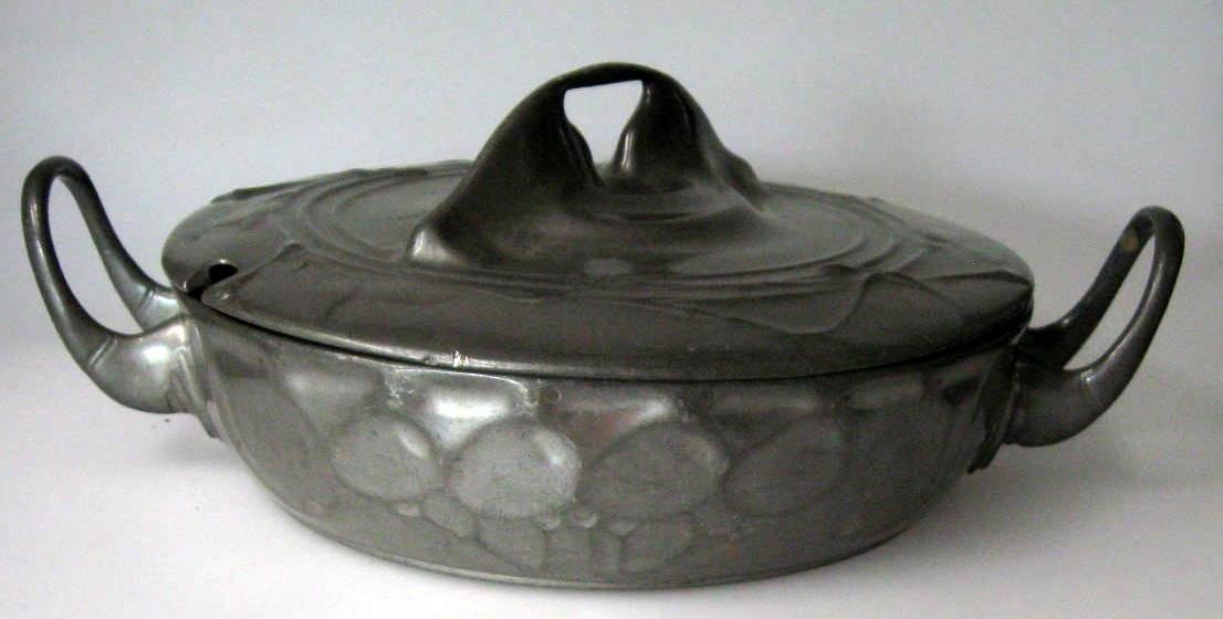 Tysk terrin, tin, o. 1900, dekoreret med bladværk. Med to store hanke. Låg med dekoration og hank. Ingen synlige stempler. H.: 13 cm. Dia.: 30 cm. Perfekt stand!