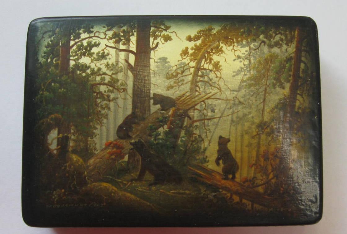 Russisk lakæske, 20. årh. Håndmalet. Dekoreret med bjørne i skoven.