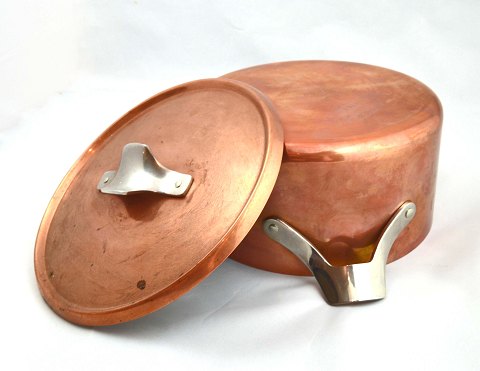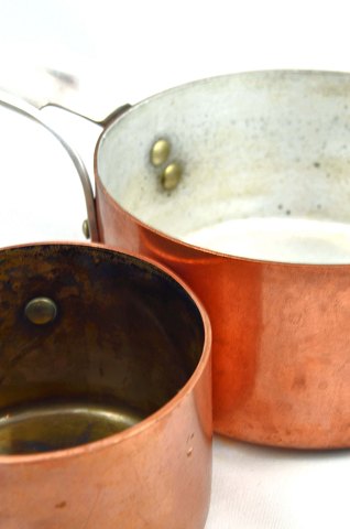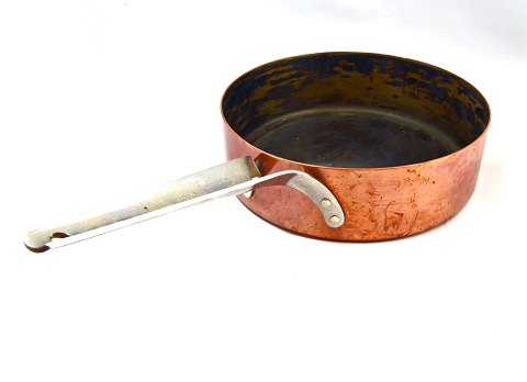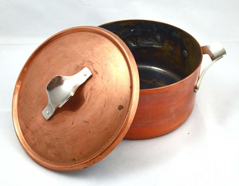 Kobber udvendig, indvendigt sølvbelagt og med stålhank.