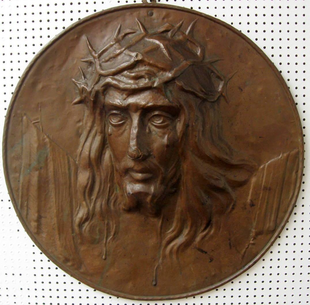 Kobberplaquette med Kristus. Frankrig, 0. 1900. Dia.: 47,5 cm. Næsen er repareret.