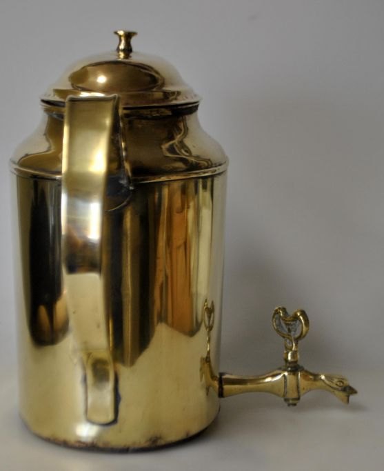 Water machine, empire, brass, c. 1810 - 1820. Denmark. Smooth body with two handles and tap in the form of dolphin. On brazier with lion feet. H .: 31 cm. B .: 24 cm.