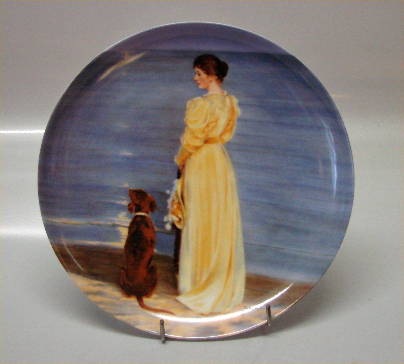 Bing & Grøndahl platter fra Skagensmalerne B&G 1986 Sommer i Skagen platte nr. 1. "Sommeraften ved Skagen: Kunstneren hustru med hund i strandkanten. PS. Krøjer 21 cm
