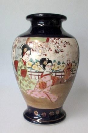 Satsuma vase, Japan, o. 1900. Med blå overglasur med forgyldninger. To polykrome scener med kvinder og en præst. Signeret. H.: 19 cm.