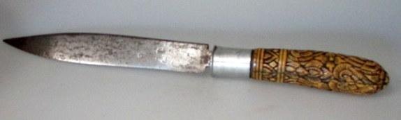 Antik orientalsk dolk, 19. årh. Med skæfte i smukt udskåret ben med dekorationer i form af bladværk. Klingen er lige og enægget undtaget ved spidsen. L.: 34 cm. Kræver samlertilladelse.