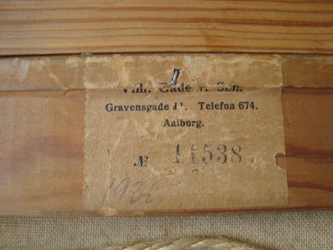 Bagpå mærkat fra Galleri Gade, Aalborg fra 1931 med no. 11538.