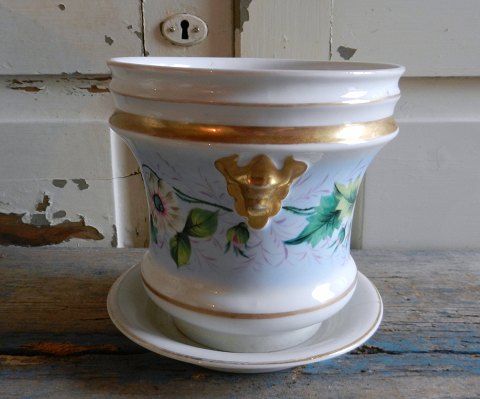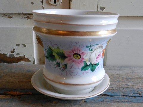 Smuk gammel urtepotteskjuler med håndmalet blomster dekoration. Fremstår med original underskål.