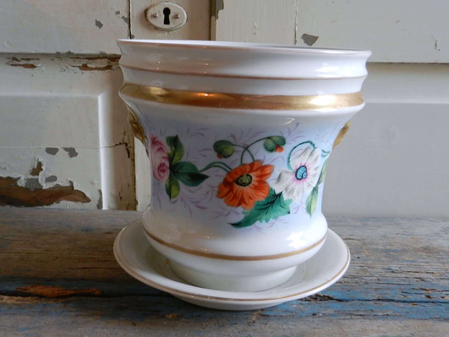 Smuk gammel urtepotteskjuler med håndmalet blomster dekoration