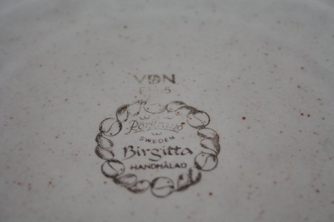 Rørstrand, Birgitta. Gråt stoneware med håndmalede blomster og brun kant.