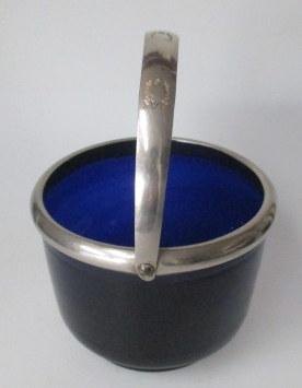 Sukker kumme i cobolt blåt glas, o. 1900. Afsprængt i bunden. Med kant og hank i nikkel med dekorationer. H.: 7,5 cm. Dia.: 10,5 cm.