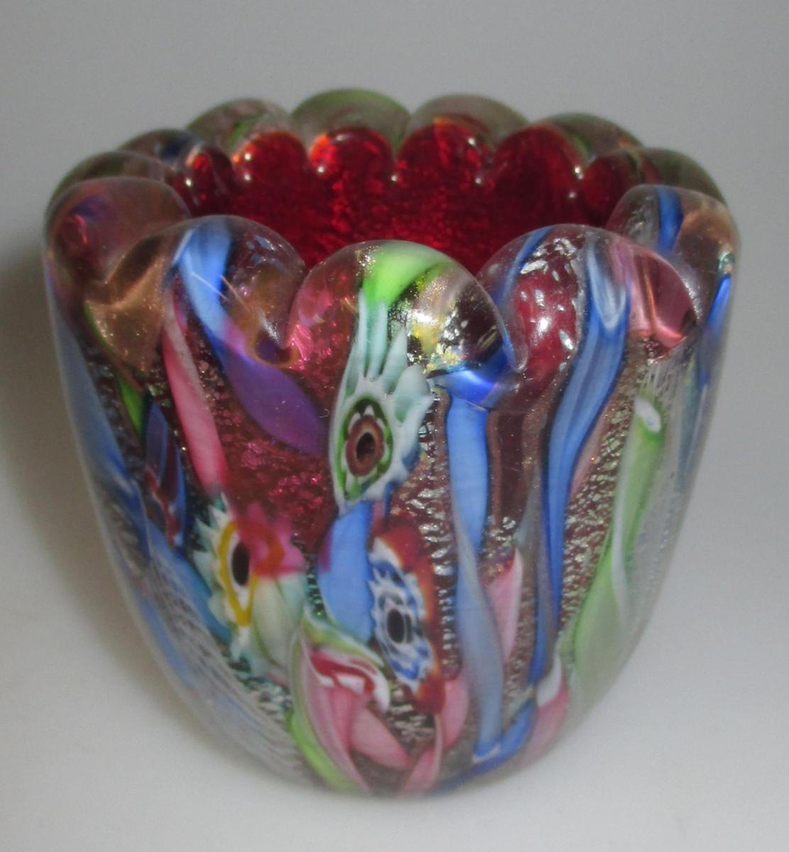 Vase, Toso, Aureliano, Venedig, Italien, ca. 1955. Dino Martens. Rødt glas med indlagt sølvfolie, derover klart overfangsglas. Mellemstykke med glasstave og millifiori. Med hvælvet kant. H.: 6,5 cm. Sleben bund,