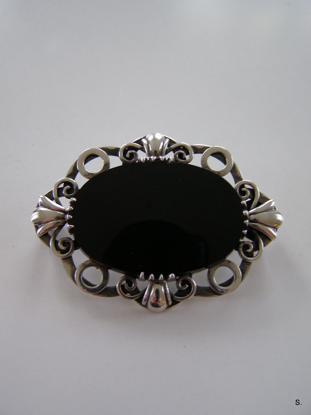 Fin gammel Broche med sort sten/onyx L: 5 cm. H: 3,5 cm