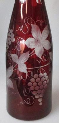 Bøhmisk krystal karaffel, 20. årh. Klar krystalmasse med rødt overfang. Overfang slebet med drueklaser og vinløv. Med prop. H.: 41 cm.