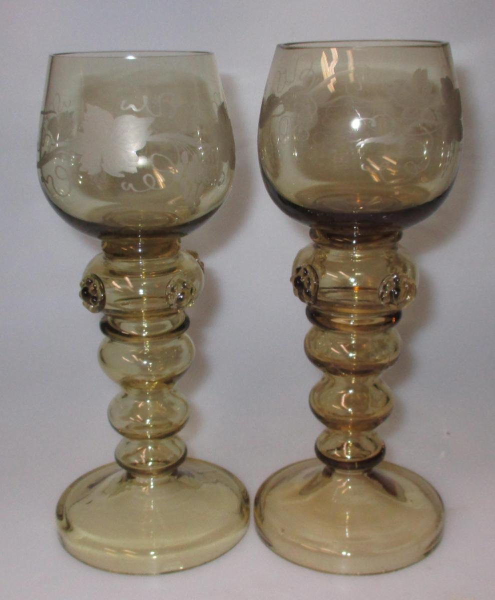 Rømerglas. 19. årh. ca. 1890. Med balusterformet stilk med 4 rosetter. Kuppa med slibninger i form af vinløv og drueklaser. H.: 19,5 cm. Pt. 9 stk. Pris pr. stk.