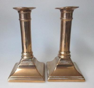 Par danske 1800-tals stager i messing. Kvadratisk fod, glat stamme. Den ene krave med revne. H.: 17 cm.