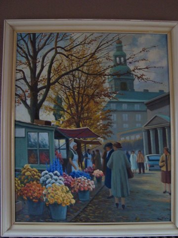 Text available in Danish: Maleri af Chr. Jensen Virklund - Blomstersælgerne ved Christiansborg Slotskirke.