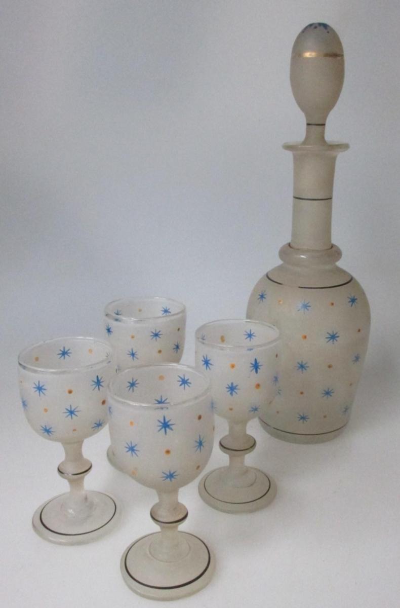 Likør- eller vodka sæt, bestående karaffel og 4 glas, 19. årh. Klar glasmasse, der er sandblæst, og emaljebemalinger i form af stjerner og prikker. Steg dekorationer i guld og sølv. Højde på karaffel med prop: 24 cm. Højde glas: 8,5 cm. Sælges kun samlet.