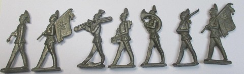 Samling tyske tinsoldater, 19. årh. I alt 7 stk. Musikkorps med to fanebærere. H.: 7 cm.