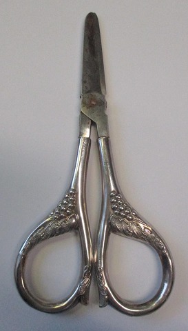 Druesaks i sterling, Danmark. Stemplet: HJ for Hans Jensen og Co, Aarhus efter 1957. L.: 14 cm. Med dekoration i form af vinløv og druer.