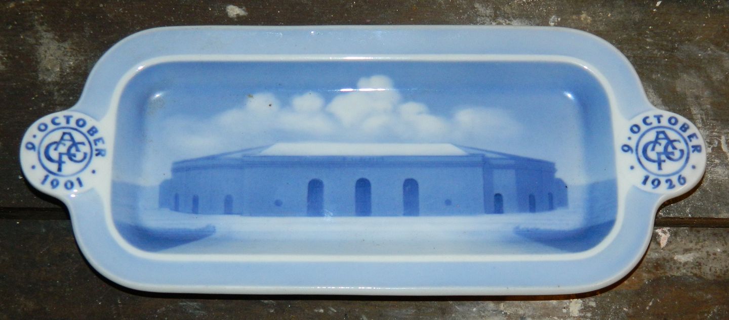 Bakke til skriveredskaber fra Bing & Grødahl. Fremstillet i 1926. Motiv med Forum i København, der blev sprængt i luften under 2. Verdenskrig i august 1943. Bakken fremstår i perfekt stand. 1. sortering. Fabriksmærket på bagsiden. 2½ cm høj 26 cm bred og 11 cm dyb.