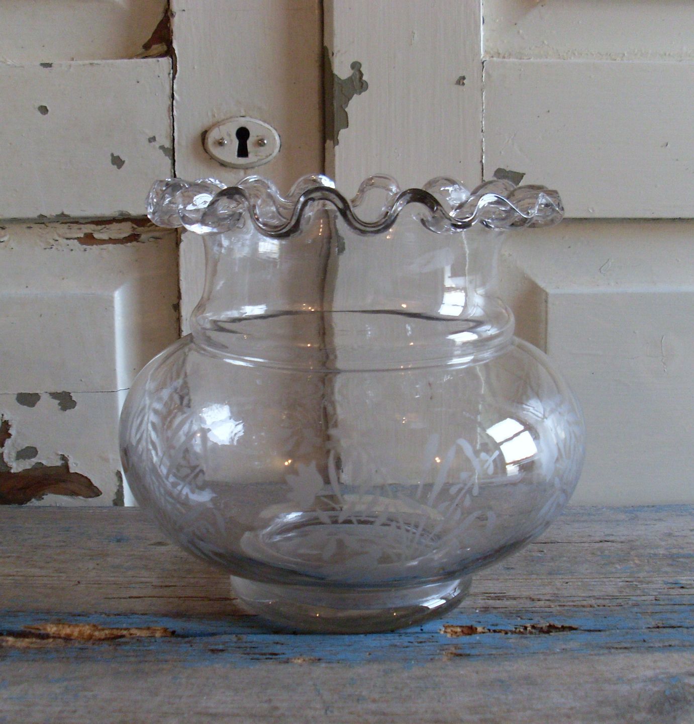 Smukt tysk 1800tals fiskeglas med bølget kant og ætset dekoration.