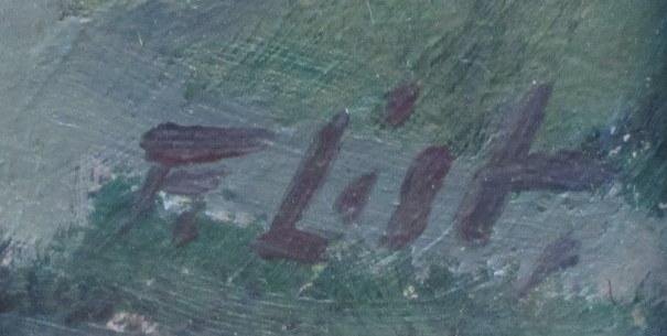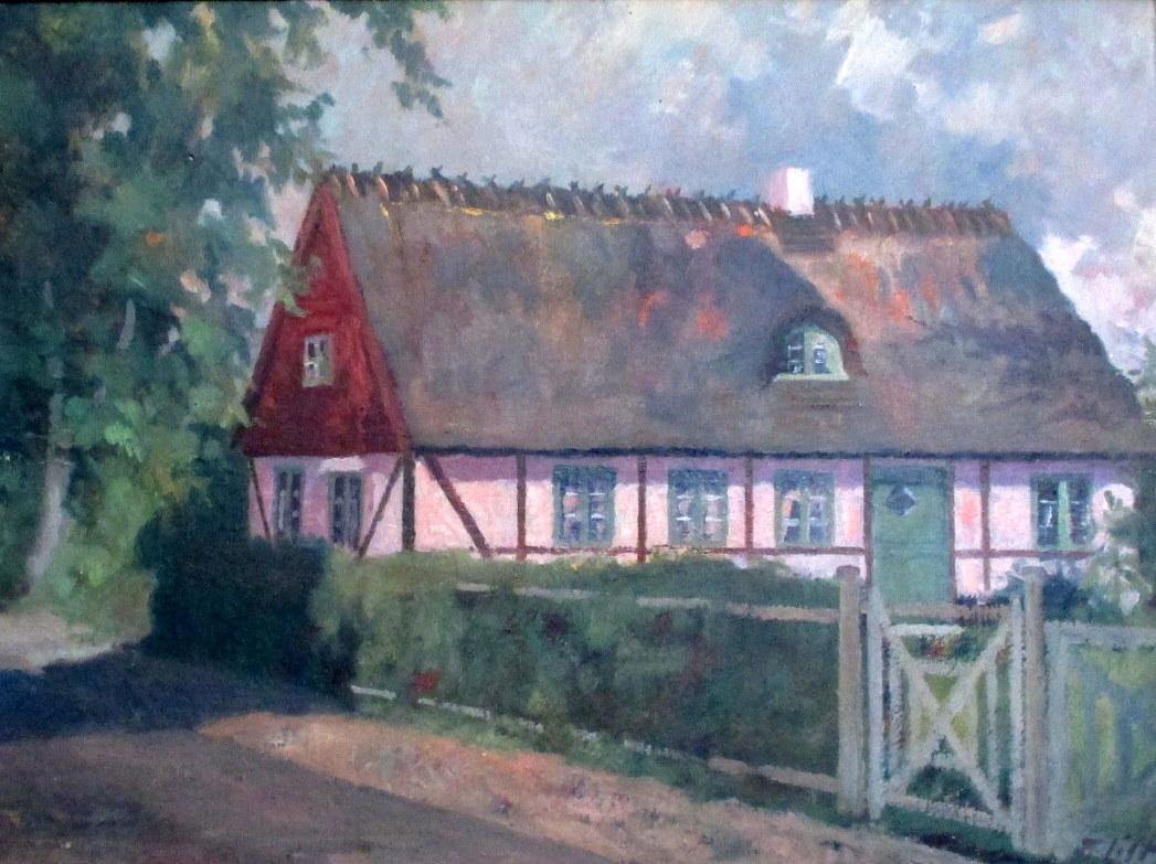 List, Franz (1898 - 1986) Danmark: Et bindingsværkshus. Olie på masonit. 21,5 x 28,5 cm. Signeret.: F. List. Motivet er antagelig fra Fanø. Indrammet: 28 x 35 cm.